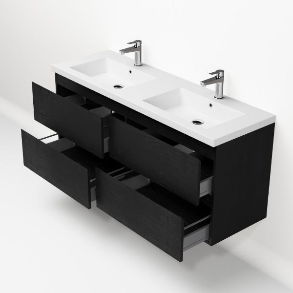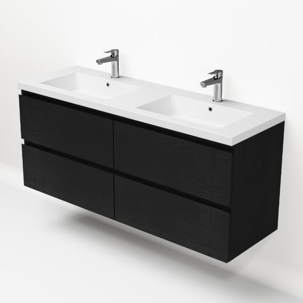 Greeploos badkamermeubel in de kleur zwart mat eiken is 140 cm breed.  De wastafel is vervaardig in polystone en heeft de kleur wit. Dit badkamermeubel met deze wastafel is leverbaar tussen de 60 cm t/m 200 cm