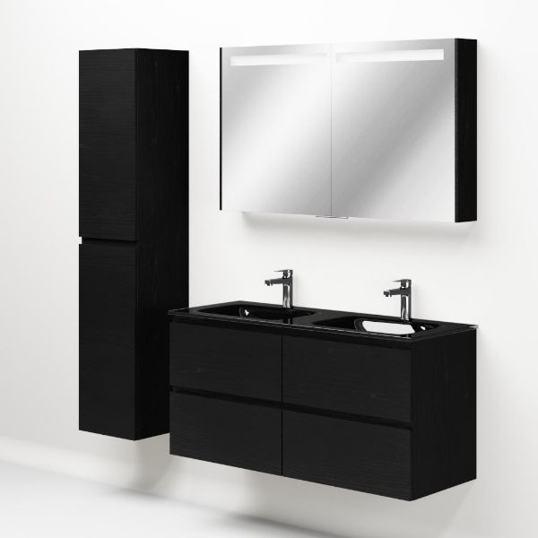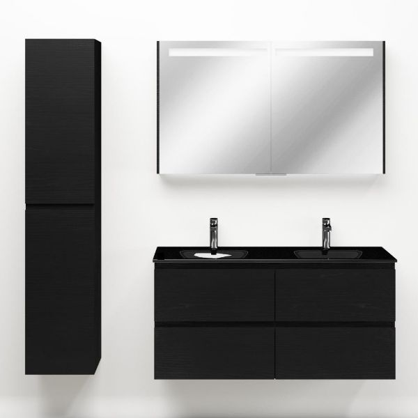 Greeploos badkamermeubel in de kleur zwart mat eiken is 120 cm breed. De wastafel is vervaardig in glas en heeft de kleur zwart mat. Dit badkamermeubel met deze wastafel is leverbaar tussen de 60 cm t/m 140 cm