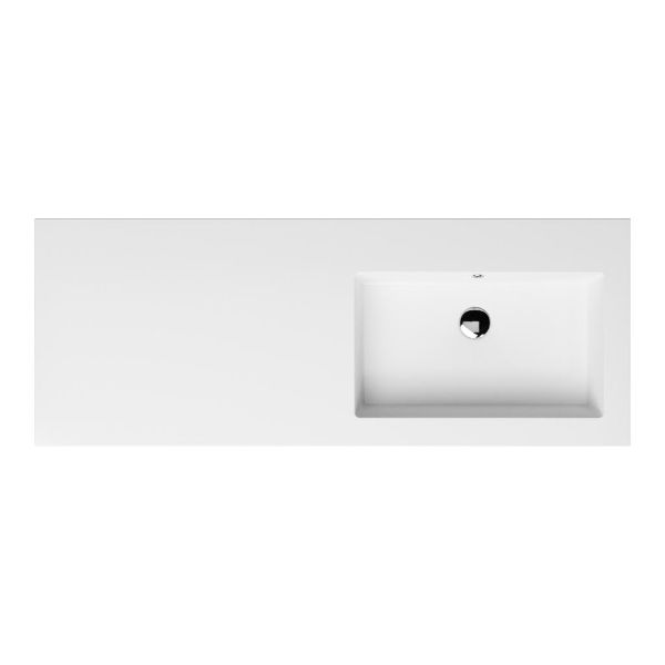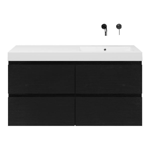 Greeploos badkamermeubel in de kleur zwart mat eiken is 120 cm breed.  De wastafel is vervaardig in polystone en heeft de kleur wit. Dit badkamermeubel met deze wastafel is leverbaar tussen de 60 cm t/m 200 cm