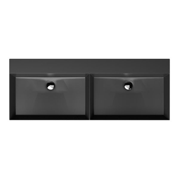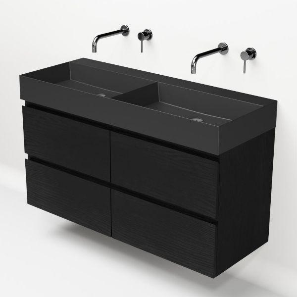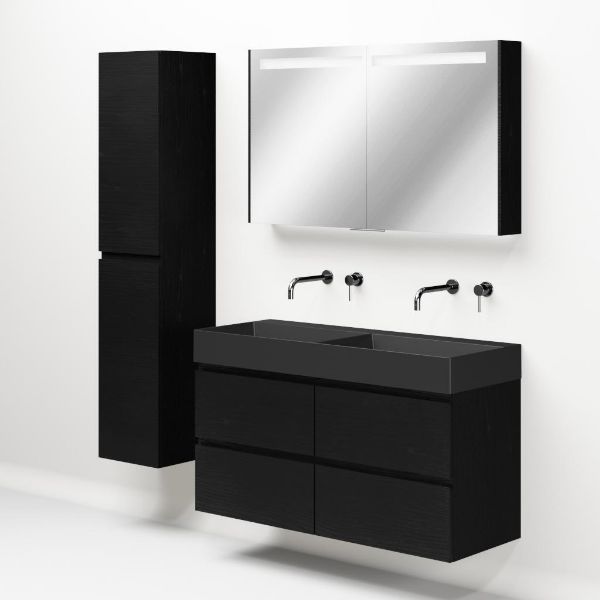 Greeploos badkamermeubel in de kleur zwart mat eiken is 120 cm breed. De wastafel is vervaardig in keramiek en heeft de kleur antraciet mat keramiek. Dit badkamermeubel met deze wastafel is leverbaar tussen de 60 cm t/m 160 cm