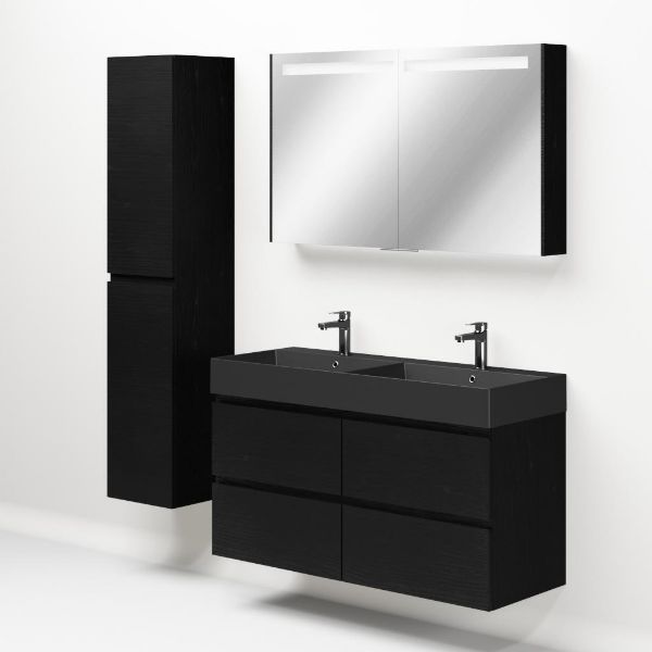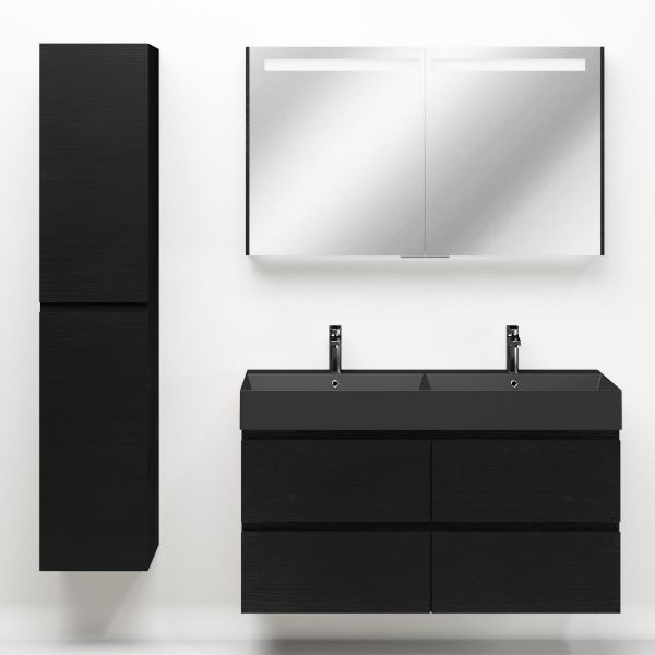 Greeploos badkamermeubel in de kleur zwart mat eiken is 120 cm breed.  De wastafel is vervaardig in keramiek en heeft de kleur antraciet mat keramiek. Dit badkamermeubel met deze wastafel is leverbaar tussen de 60 cm t/m 160 cm