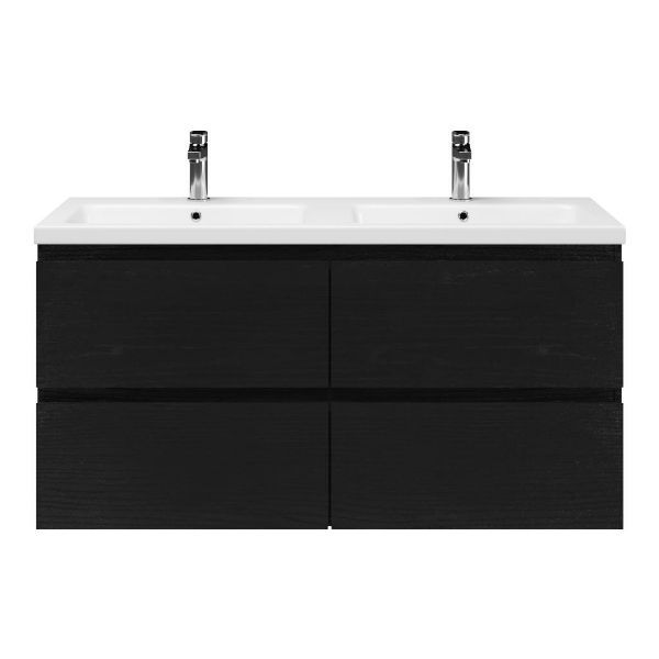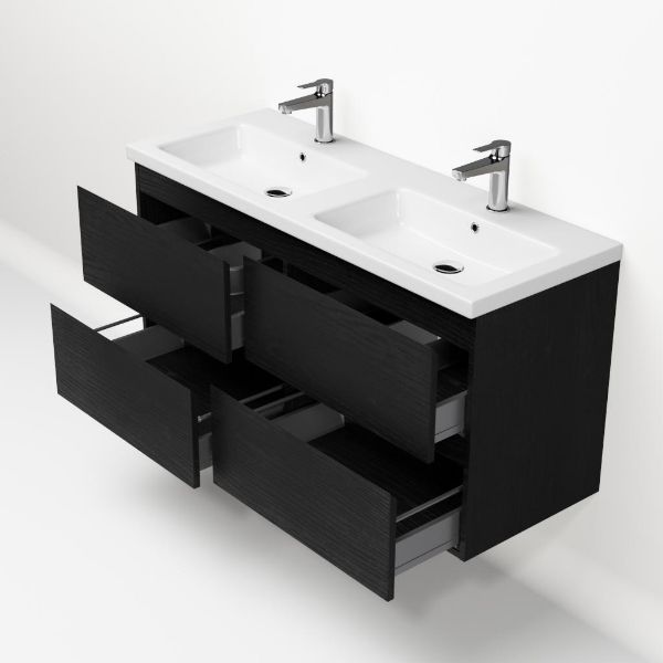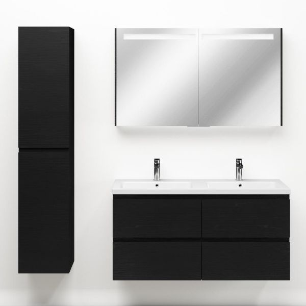 | | Bellanti Gisella/Amelia badmeubel 120x46 4 softclose laden zwart mat eiken greeploos keramische wastafel dubbel wit glans met 2 kraangaten |