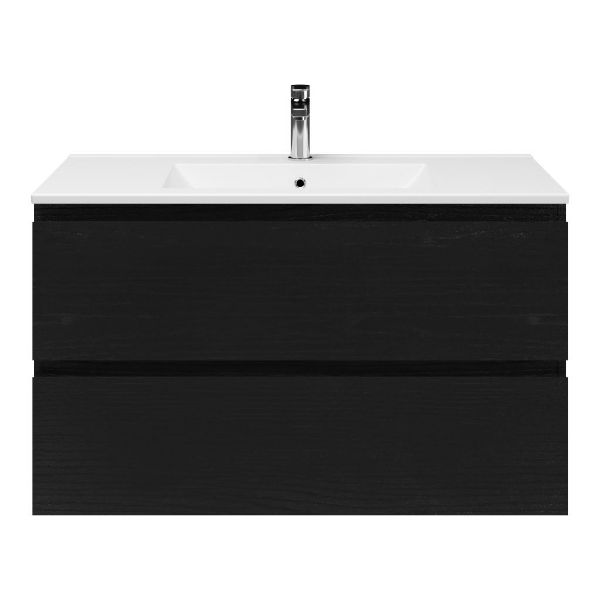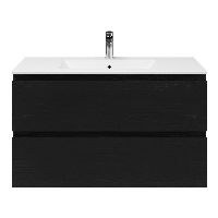 Greeploos badkamermeubel in de kleur zwart mat eiken is 100 cm breed. De wastafel is vervaardig in keramiek en heeft de kleur wit keramiek. Dit badkamermeubel met deze wastafel is leverbaar tussen de 60 cm t/m 120 cm
