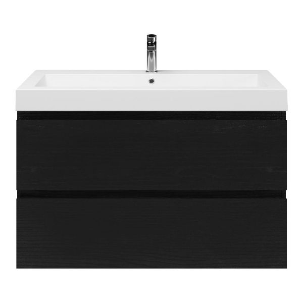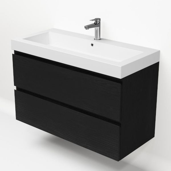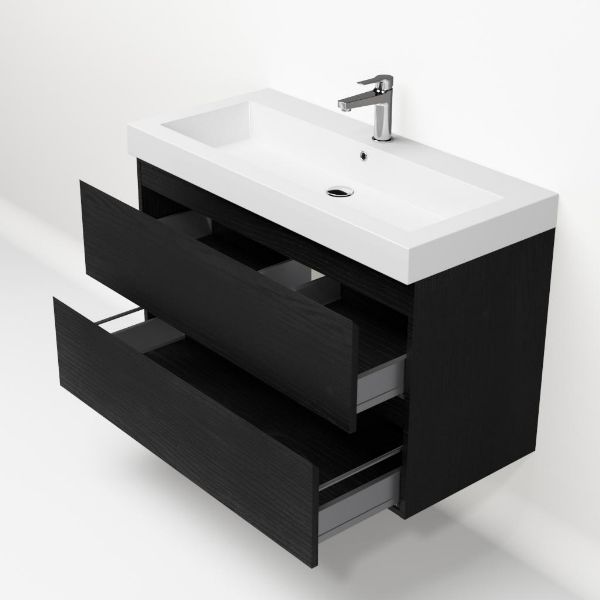 Greeploos badkamermeubel in de kleur zwart mat eiken is 100 cm breed. De wastafel is vervaardig in polystone en heeft de kleur wit. Dit badkamermeubel met deze wastafel is leverbaar tussen de 60 cm t/m 200 cm