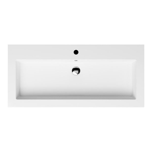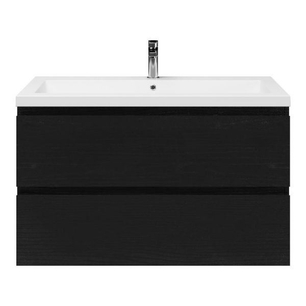 Greeploos badkamermeubel in de kleur zwart mat eiken is 100 cm breed. De wastafel is vervaardig in polystone en heeft de kleur wit. Dit badkamermeubel met deze wastafel is leverbaar tussen de 60 cm t/m 200 cm