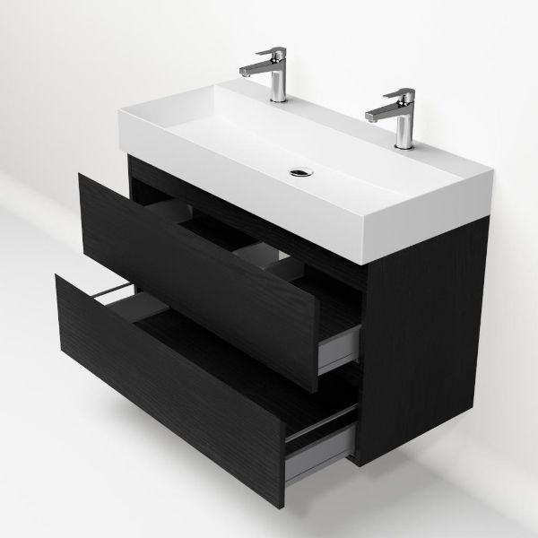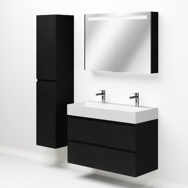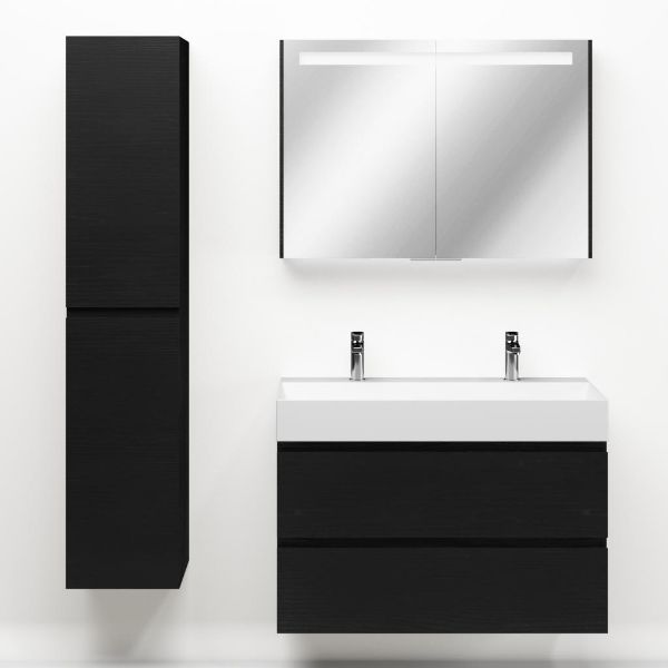 Greeploos badkamermeubel in de kleur zwart mat eiken is 100 cm breed.  De wastafel is vervaardig in keramiek en heeft de kleur wit mat keramiek. Dit badkamermeubel met deze wastafel is leverbaar tussen de 60 cm t/m 160 cm