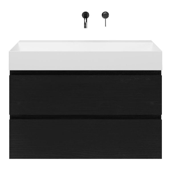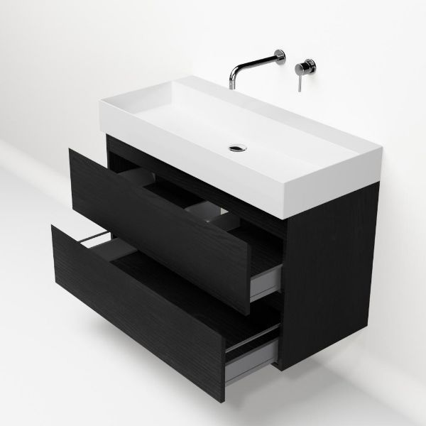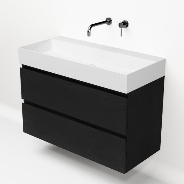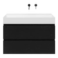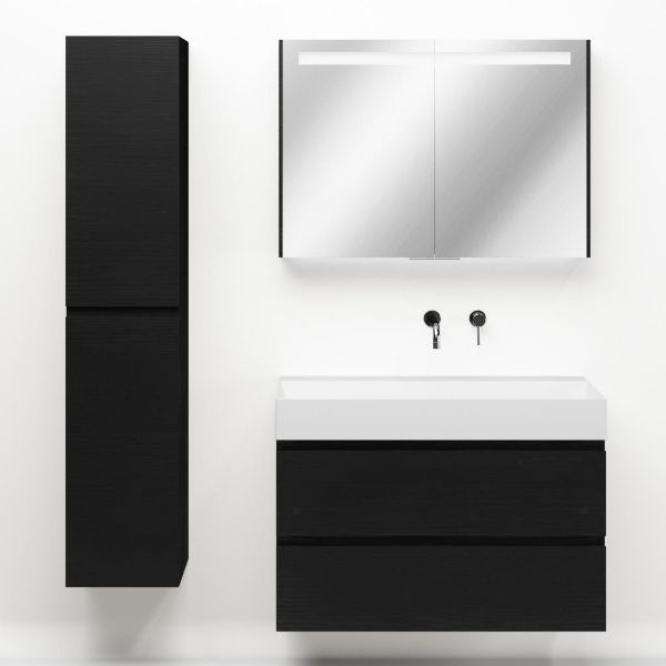 Greeploos badkamermeubel in de kleur zwart mat eiken is 100 cm breed. De wastafel is vervaardig in keramiek en heeft de kleur wit keramiek. Dit badkamermeubel met deze wastafel is leverbaar tussen de 60 cm t/m 160 cm
