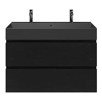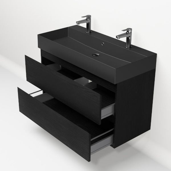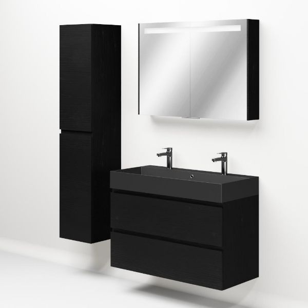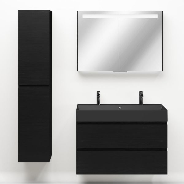 Greeploos badkamermeubel in de kleur zwart mat eiken is 100 cm breed.  De wastafel is vervaardig in keramiek en heeft de kleur antraciet mat keramiek. Dit badkamermeubel met deze wastafel is leverbaar tussen de 60 cm t/m 160 cm