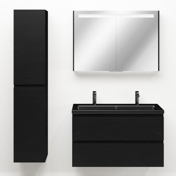 Greeploos badkamermeubel in de kleur zwart mat eiken is 100 cm breed. De wastafel is vervaardig in keramiek en heeft de kleur zwart mat keramiek. Dit badkamermeubel met deze wastafel is leverbaar tussen de 60 cm t/m 120 cm