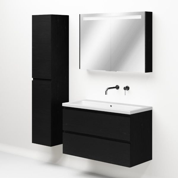 Greeploos badkamermeubel in de kleur zwart mat eiken is 100 cm breed. De wastafel is vervaardig in keramiek en heeft de kleur wit mat keramiek. Dit badkamermeubel met deze wastafel is leverbaar tussen de 60 cm t/m 120 cm
