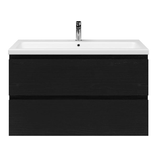 Greeploos badkamermeubel in de kleur zwart mat eiken is 100 cm breed. De wastafel is vervaardig in keramiek en heeft de kleur wit mat keramiek. Dit badkamermeubel met deze wastafel is leverbaar tussen de 60 cm t/m 120 cm