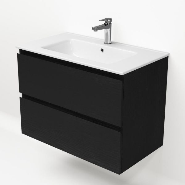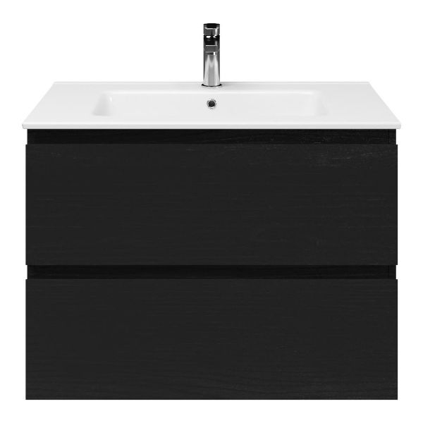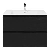 Greeploos badkamermeubel in de kleur zwart mat eiken is 80 cm breed. De wastafel is vervaardig in keramiek en heeft de kleur wit keramiek. Dit badkamermeubel met deze wastafel is leverbaar tussen de 60 cm t/m 120 cm