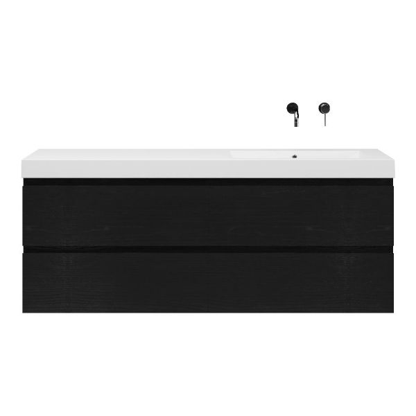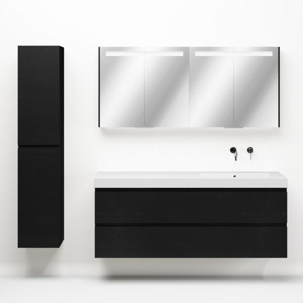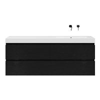 Greeploos badkamermeubel in de kleur zwart mat eiken is 160 cm breed. De wastafel is vervaardig in polystone en heeft de kleur wit. Dit badkamermeubel met deze wastafel is leverbaar tussen de 60 cm t/m 200 cm