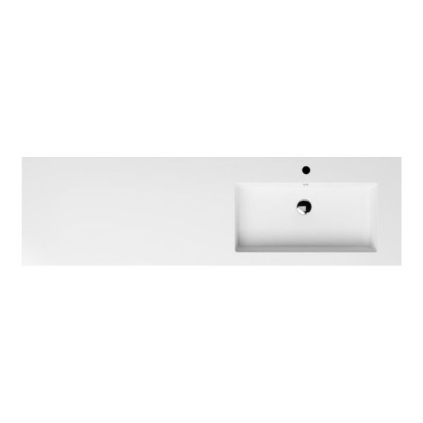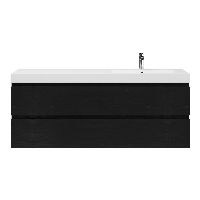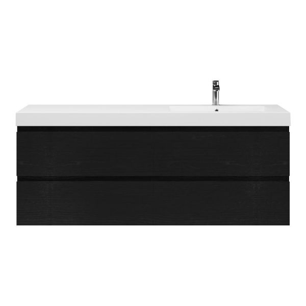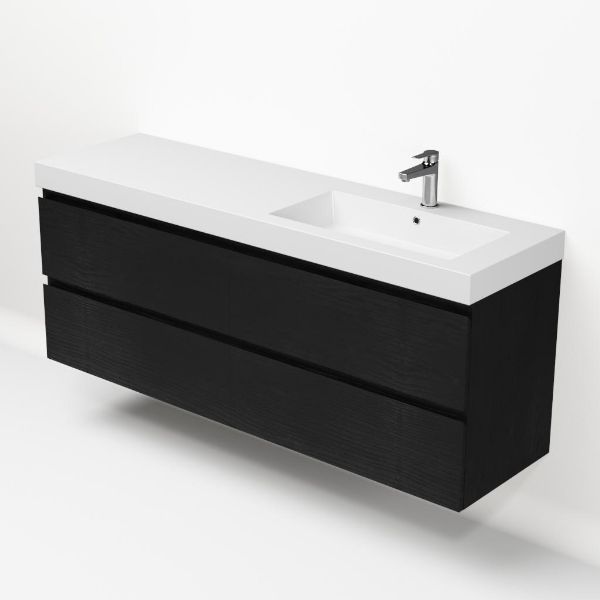 Greeploos badkamermeubel in de kleur zwart mat eiken is 160 cm breed. De wastafel is vervaardig in polystone en heeft de kleur wit. Dit badkamermeubel met deze wastafel is leverbaar tussen de 60 cm t/m 200 cm