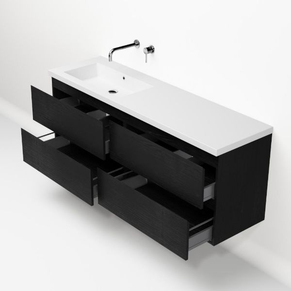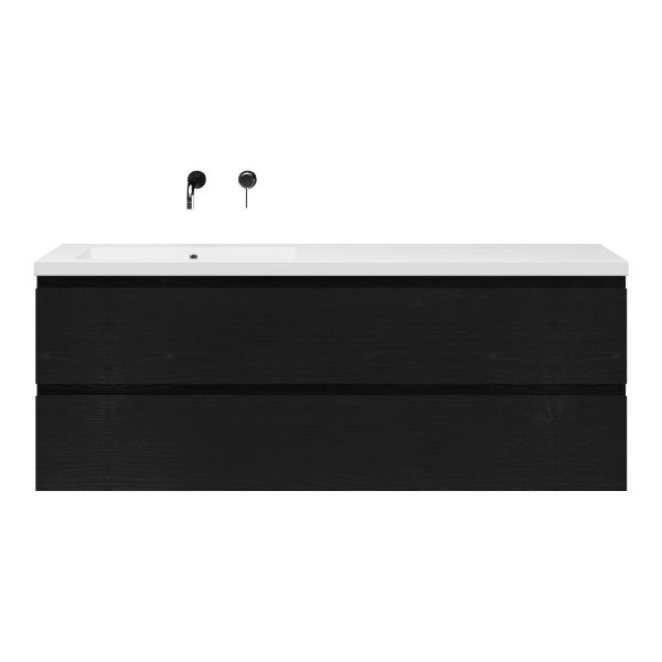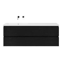 Greeploos badkamermeubel in de kleur zwart mat eiken is 160 cm breed.  De wastafel is vervaardig in polystone en heeft de kleur wit. Dit badkamermeubel met deze wastafel is leverbaar tussen de 60 cm t/m 200 cm