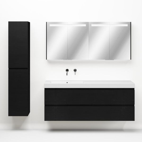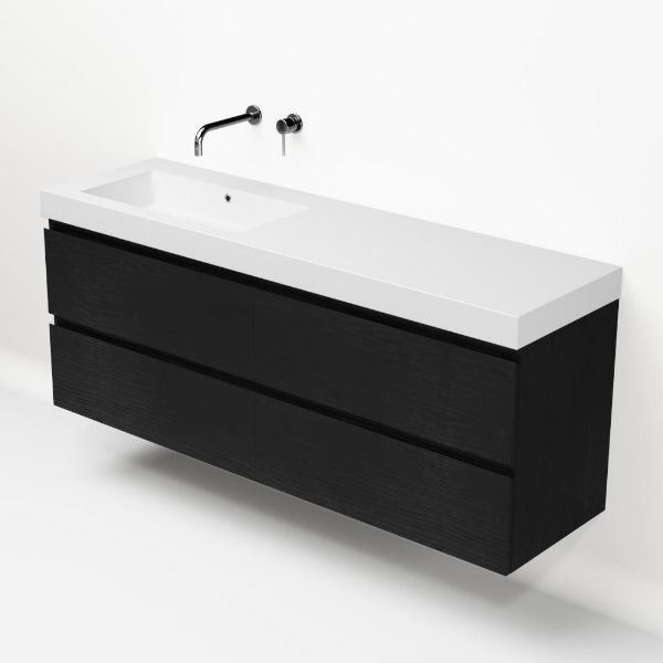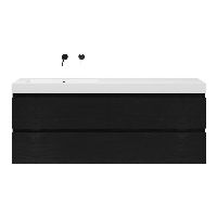 Greeploos badkamermeubel in de kleur zwart mat eiken is 160 cm breed. De wastafel is vervaardig in polystone en heeft de kleur wit. Dit badkamermeubel met deze wastafel is leverbaar tussen de 60 cm t/m 200 cm