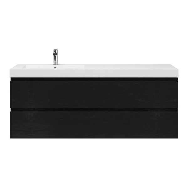Greeploos badkamermeubel in de kleur zwart mat eiken is 160 cm breed.  De wastafel is vervaardig in polystone en heeft de kleur wit. Dit badkamermeubel met deze wastafel is leverbaar tussen de 60 cm t/m 200 cm