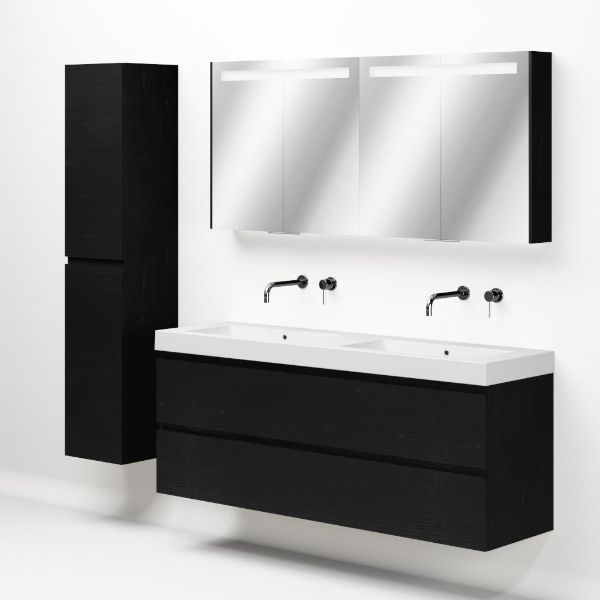 Greeploos badkamermeubel in de kleur zwart mat eiken is 160 cm breed.  De wastafel is vervaardig in polystone en heeft de kleur wit. Dit badkamermeubel met deze wastafel is leverbaar tussen de 60 cm t/m 200 cm