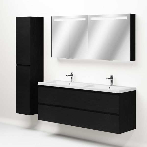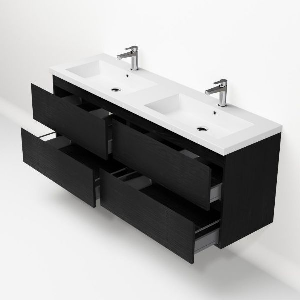| | Bellanti Gisella/Esta badmeubel 160x46 4 softclose laden zwart mat eiken greeploos polystone dubbele wastafel wit met 2 kraangaten |