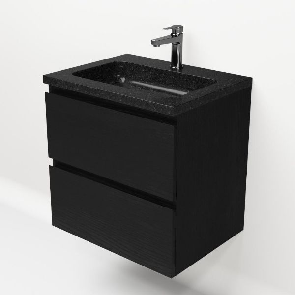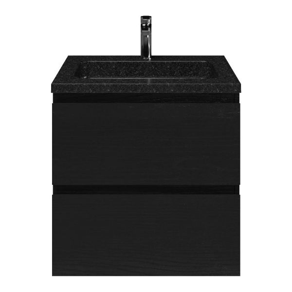 Greeploos badkamermeubel in de kleur zwart mat eiken is 60 cm breed. De wastafel is vervaardig in natuursteen en heeft de kleur shanxi black. Dit badkamermeubel met deze wastafel is leverbaar tussen de 60 cm t/m 120 cm
