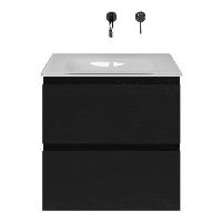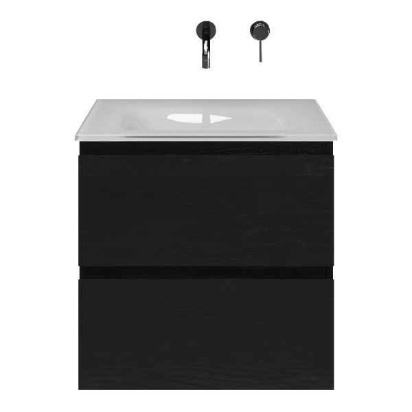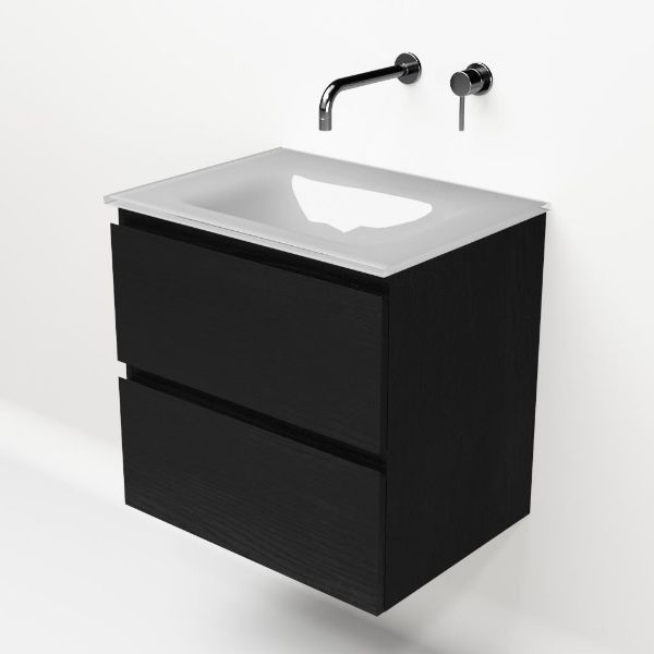 Greeploos badkamermeubel in de kleur zwart mat eiken is 60 cm breed. De wastafel is vervaardig in glas en heeft de kleur wit. Dit badkamermeubel met deze wastafel is leverbaar tussen de 60 cm t/m 140 cm