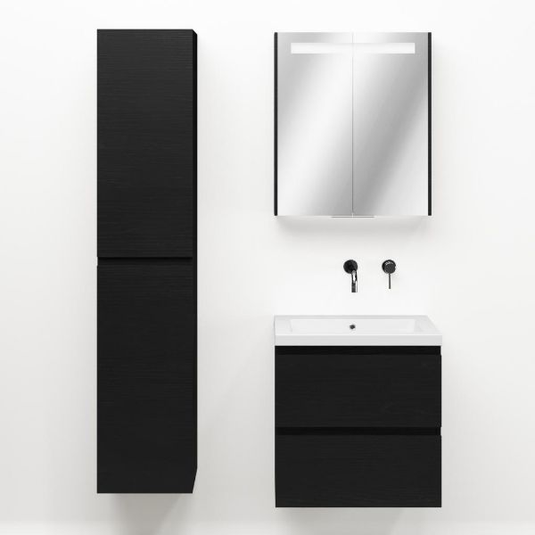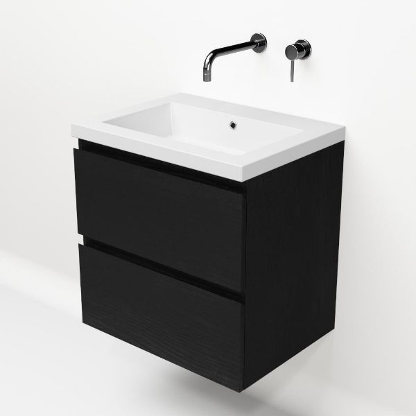 Greeploos badkamermeubel in de kleur zwart mat eiken is 60 cm breed.  De wastafel is vervaardig in polystone en heeft de kleur wit. Dit badkamermeubel met deze wastafel is leverbaar tussen de 60 cm t/m 200 cm