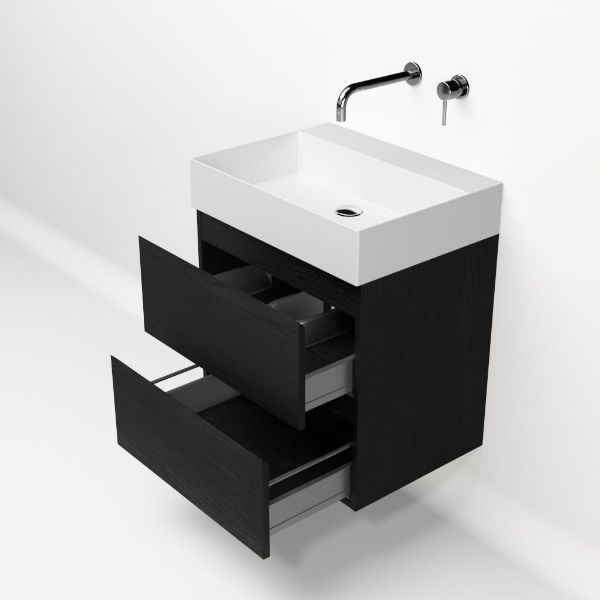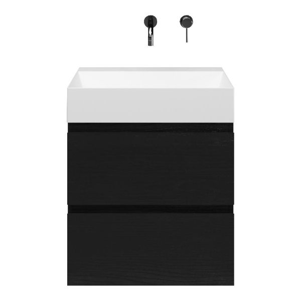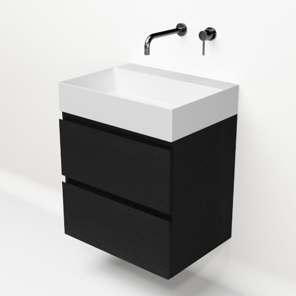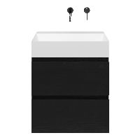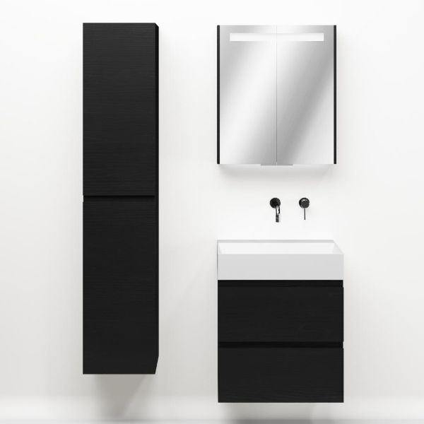 Greeploos badkamermeubel in de kleur zwart mat eiken is 60 cm breed. De wastafel is vervaardig in keramiek en heeft de kleur wit mat keramiek. Dit badkamermeubel met deze wastafel is leverbaar tussen de 60 cm t/m 160 cm