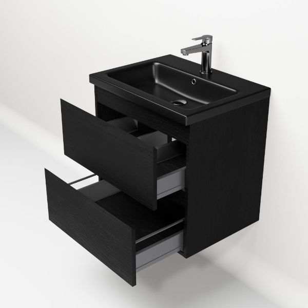 Greeploos badkamermeubel in de kleur zwart mat eiken is 60 cm breed. De wastafel is vervaardig in keramiek en heeft de kleur zwart mat keramiek. Dit badkamermeubel met deze wastafel is leverbaar tussen de 60 cm t/m 120 cm