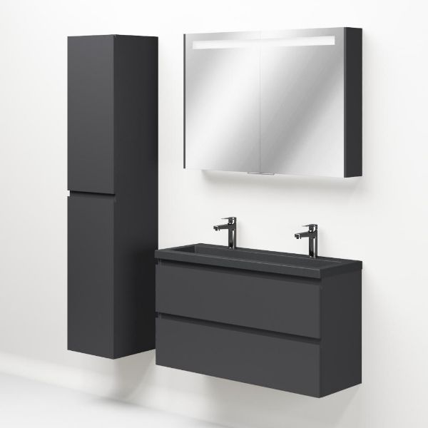 Ondiepe greeploos badkamermeubel in de kleur antraciet mat. Badmeubel is praktisch voor een compact badkamer. Het meubel van 100 cm breed is er. De wastafel is vervaardig in quartz en heeft de kleur grijs mat quartz. Dit badkamermeubel met deze wastafel is leverbaar tussen de 60 cm t/m 120 cm.