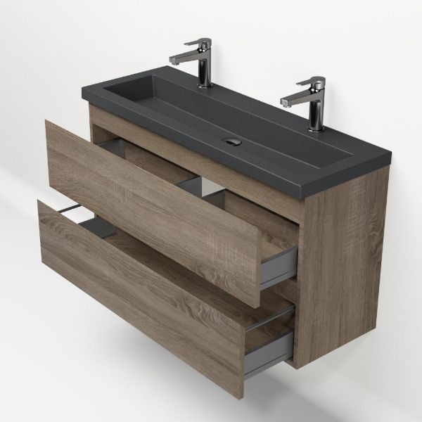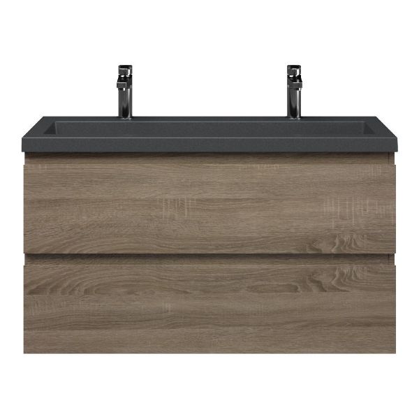 | | Bellanti Secca/Esta-Q ondiep badmeubel 100x36 2 softclose laden donker eiken greeploos met quartz wastafel mat grijs met 2 kraangaten zonder overloop |