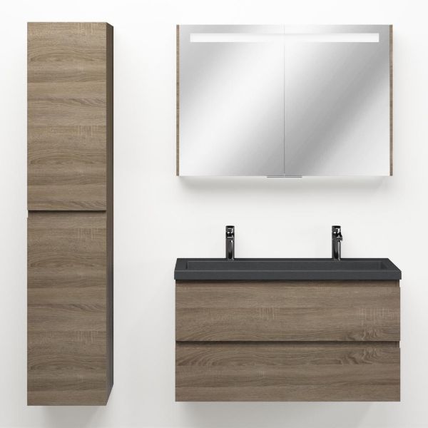 Ondiepe greeploos badkamermeubel in de kleur eiken donker. Badmeubel is praktisch voor een compact badkamer. Het meubel van 100 cm breed is er. De wastafel is vervaardig in quartz en heeft de kleur grijs mat quartz. Dit badkamermeubel met deze wastafel is leverbaar tussen de 60 cm t/m 120 cm.