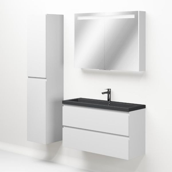 Ondiepe greeploos badkamermeubel in de kleur wit mat. Badmeubel is praktisch voor een compact badkamer. Het meubel van 100 cm breed is er. De wastafel is vervaardig in quartz en heeft de kleur grijs mat quartz. Dit badkamermeubel met deze wastafel is leverbaar tussen de 60 cm t/m 120 cm.