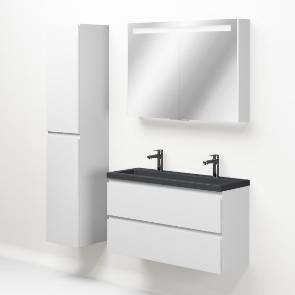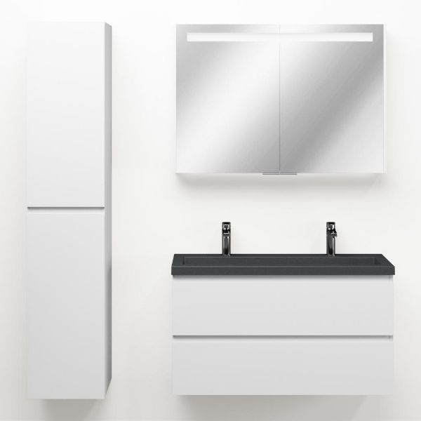 Ondiepe greeploos badkamermeubel in de kleur wit mat. Badmeubel is praktisch voor een compact badkamer. Het meubel van 100 cm breed is er. De wastafel is vervaardig in quartz en heeft de kleur grijs mat quartz. Dit badkamermeubel met deze wastafel is leverbaar tussen de 60 cm t/m 120 cm.