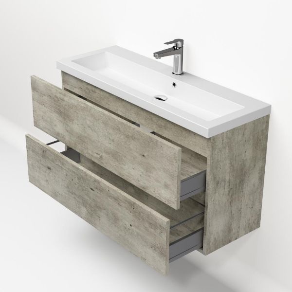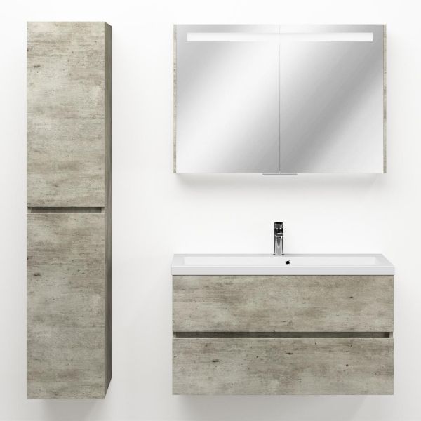 Ondiepe greeploos badkamermeubel in de kleur steigerhout licht grijs. Badmeubel is praktisch voor een compact badkamer. Het meubel van 100 cm breed is er. De wastafel is vervaardig in quartz en heeft de kleur wit mat quartz. Dit badkamermeubel met deze wastafel is leverbaar tussen de 60 cm t/m 100 cm.