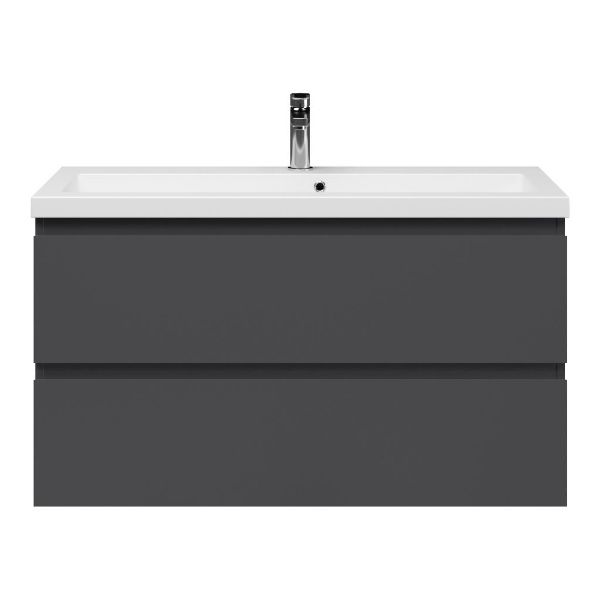 Ondiepe greeploos badkamermeubel in de kleur antraciet mat. Badmeubel is praktisch voor een compact badkamer. Het meubel van 100 cm breed is er. De wastafel is vervaardig in quartz en heeft de kleur wit mat quartz. Dit badkamermeubel met deze wastafel is leverbaar tussen de 60 cm t/m 120 cm.