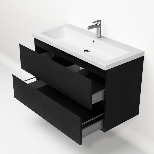 | | Bellanti Gisella/Esta-Q badmeubel 100x46 2 softclose laden zwart mat eiken greeploos quartz wastafel mat wit zonder kraangat |
