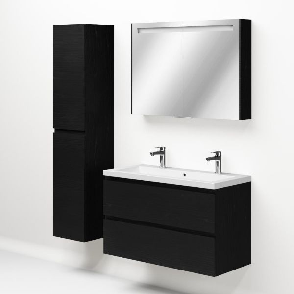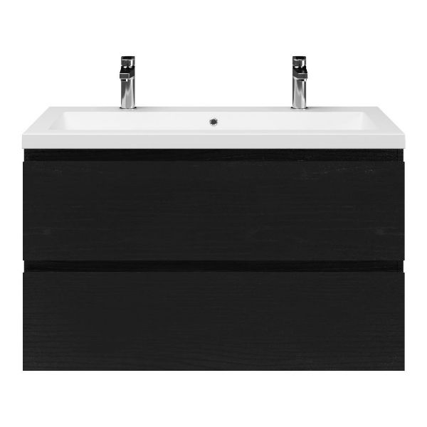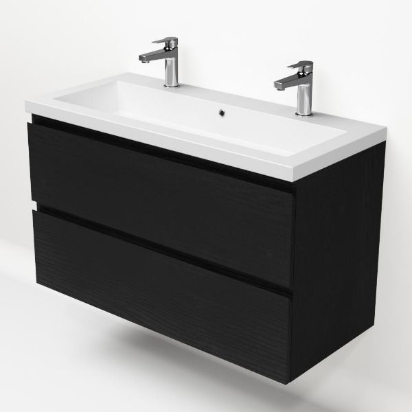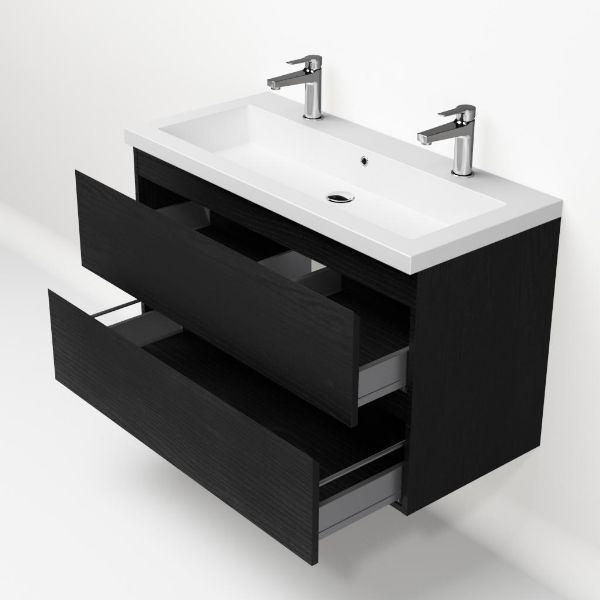 | | Bellanti Gisella/Esta-Q badmeubel 100x46 2 softclose laden zwart mat eiken greeploos wastafel mat wit met 2 kraangaten |