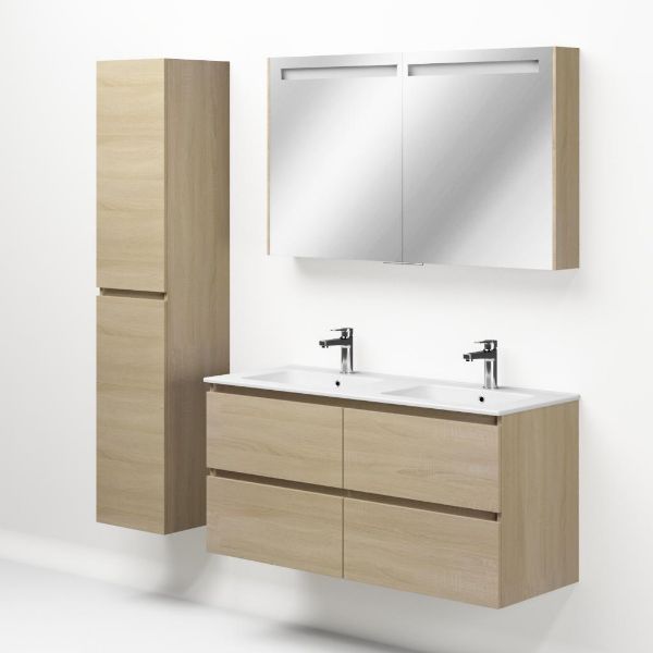 Greeploos badkamermeubel in de kleur eiken licht is 120 cm breed. De wastafel is vervaardig in keramiek en heeft de kleur wit keramiek. Dit badkamermeubel met deze wastafel is leverbaar tussen de 60 cm t/m 120 cm