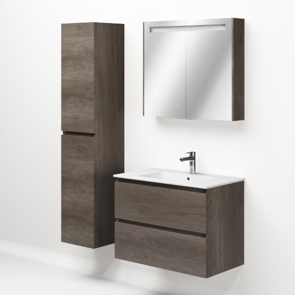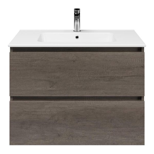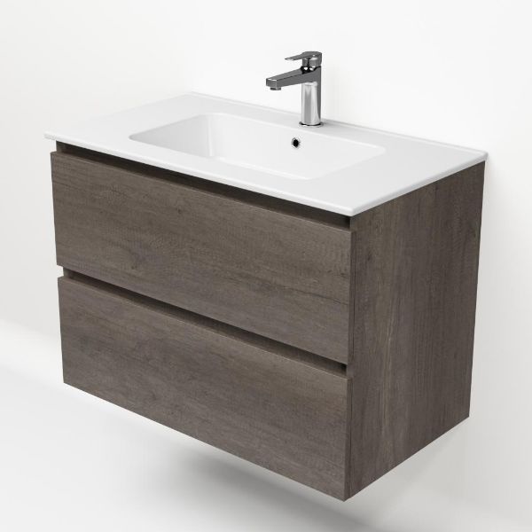 Greeploos badkamermeubel in de kleur olm donker grijs is 80 cm breed. De wastafel is vervaardig in keramiek en heeft de kleur wit keramiek. Dit badkamermeubel met deze wastafel is leverbaar tussen de 60 cm t/m 120 cm