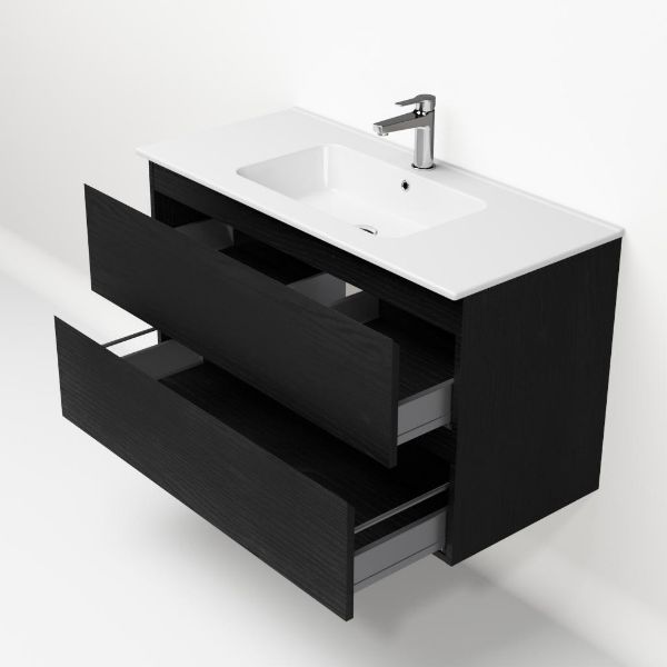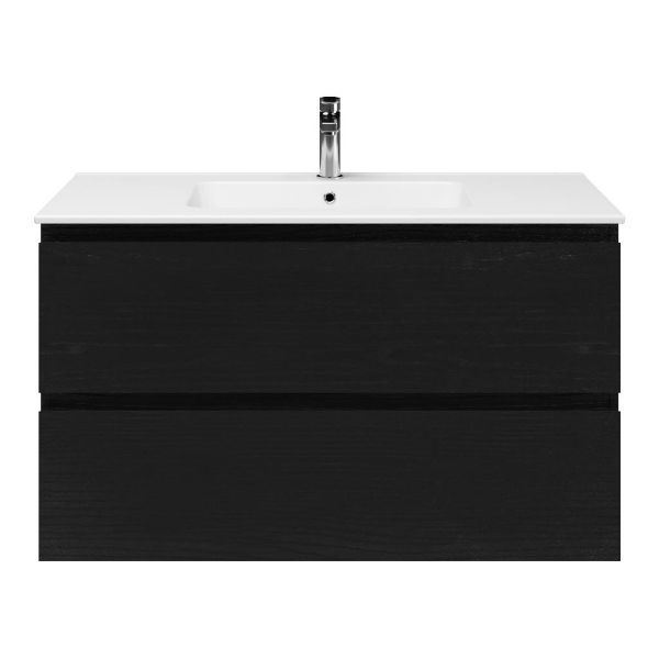Greeploos badkamermeubel in de kleur zwart mat eiken is 100 cm breed. De wastafel is vervaardig in keramiek en heeft de kleur wit keramiek. Dit badkamermeubel met deze wastafel is leverbaar tussen de 60 cm t/m 120 cm