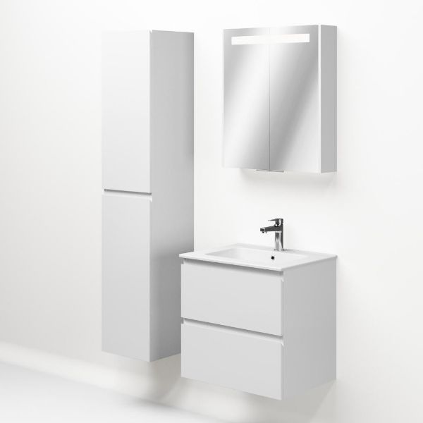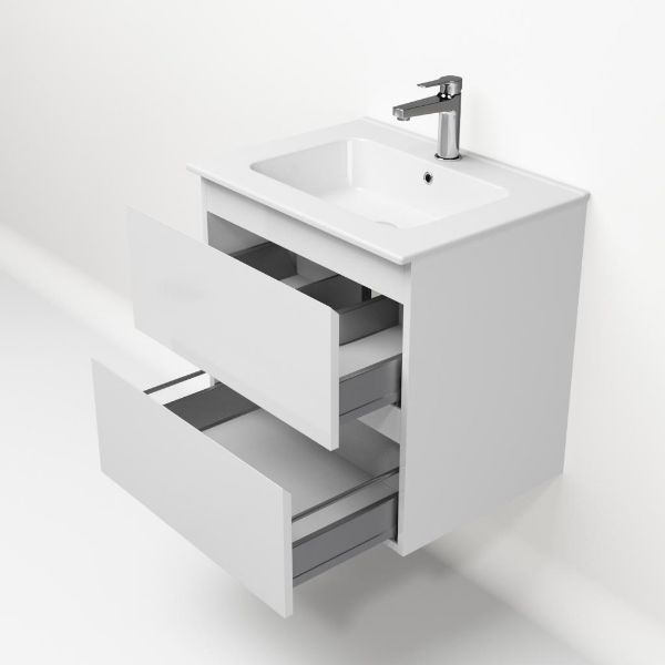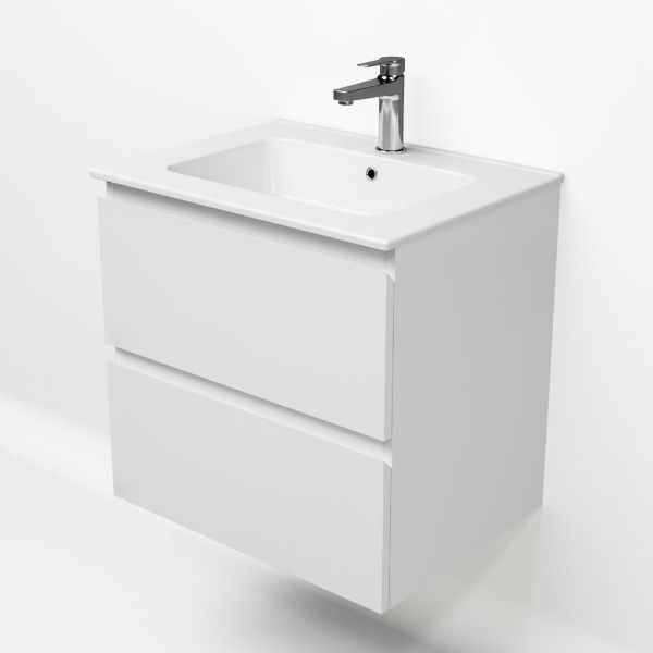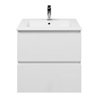Greeploos badkamermeubel in de kleur wit hoogglans is 60 cm breed. De wastafel is vervaardig in keramiek en heeft de kleur wit keramiek. Dit badkamermeubel met deze wastafel is leverbaar tussen de 60 cm t/m 120 cm