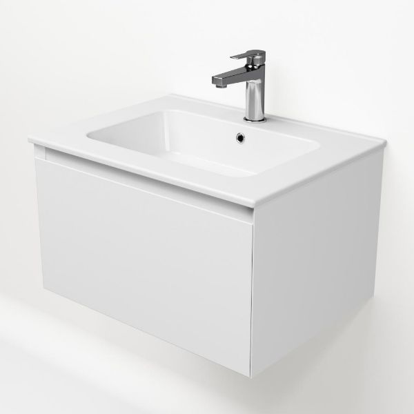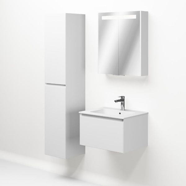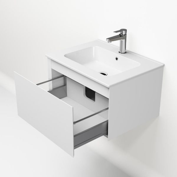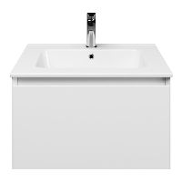 Greeploos badkamermeubel in de kleur wit mat is 60 cm breed. De wastafel is vervaardig in keramiek en heeft de kleur wit keramiek. Dit badkamermeubel met deze wastafel is leverbaar tussen de 60 cm t/m 120 cm