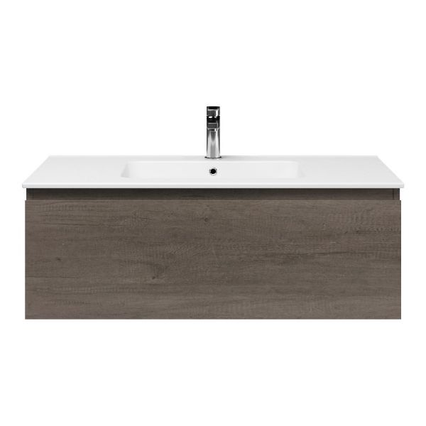 Greeploos badkamermeubel in de kleur olm donker grijs is 100 cm breed. De wastafel is vervaardig in keramiek en heeft de kleur wit keramiek. Dit badkamermeubel met deze wastafel is leverbaar tussen de 60 cm t/m 120 cm