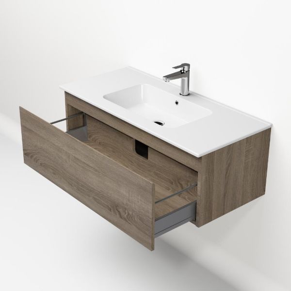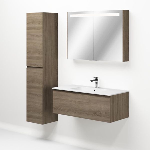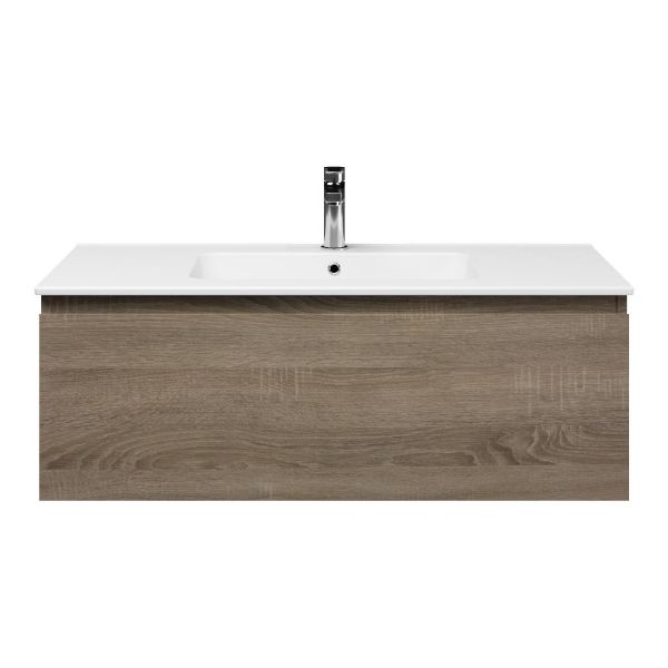 Greeploos badkamermeubel in de kleur eiken donker is 100 cm breed. De wastafel is vervaardig in keramiek en heeft de kleur wit keramiek. Dit badkamermeubel met deze wastafel is leverbaar tussen de 60 cm t/m 120 cm