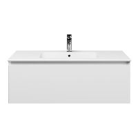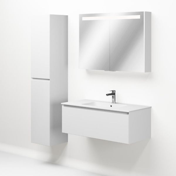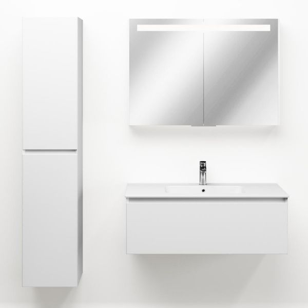 Greeploos badkamermeubel in de kleur wit mat is 100 cm breed. De wastafel is vervaardig in keramiek en heeft de kleur wit keramiek. Dit badkamermeubel met deze wastafel is leverbaar tussen de 60 cm t/m 120 cm