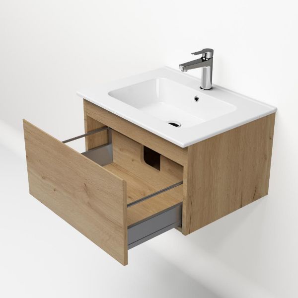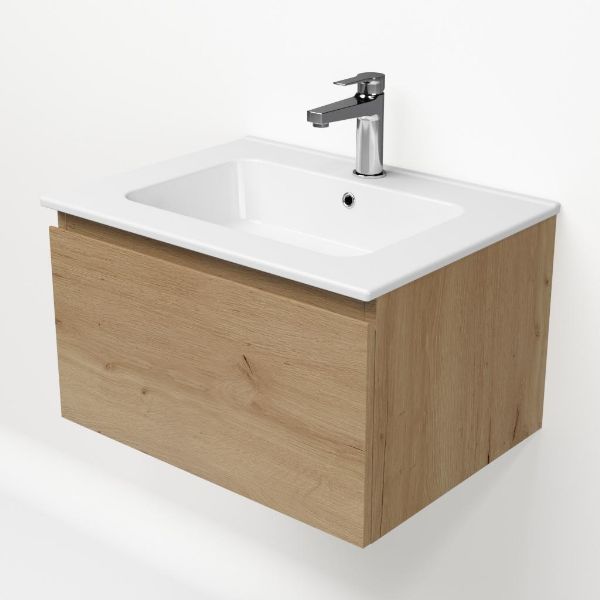 | | Bellanti Solo/Quadra badmeubel 60x46 1 softclose lade eiken natuur greeploos keramische wastafel wit met 1 kraangat |