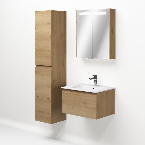 Greeploos badkamermeubel in de kleur eiken natuur is 60 cm breed. De wastafel is vervaardig in keramiek en heeft de kleur wit keramiek. Dit badkamermeubel met deze wastafel is leverbaar tussen de 60 cm t/m 120 cm
