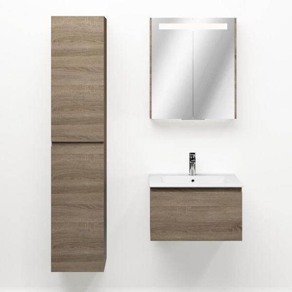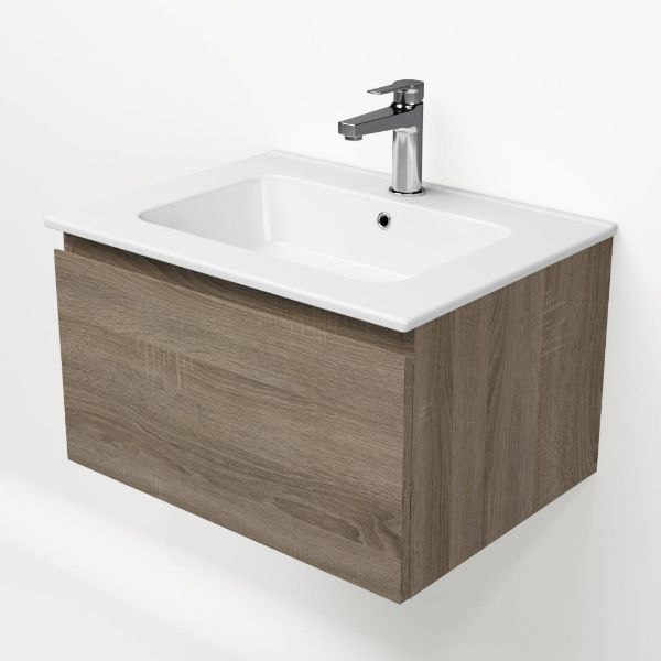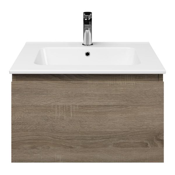 Greeploos badkamermeubel in de kleur eiken donker is 60 cm breed. De wastafel is vervaardig in keramiek en heeft de kleur wit keramiek. Dit badkamermeubel met deze wastafel is leverbaar tussen de 60 cm t/m 120 cm
