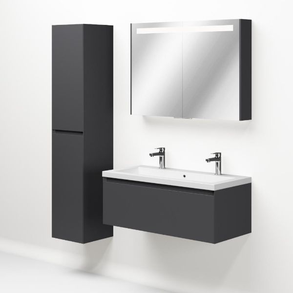 Greeploos badkamermeubel in de kleur antraciet mat is 100 cm breed. De wastafel is vervaardig in quartz en heeft de kleur wit mat quartz. Dit badkamermeubel met deze wastafel is leverbaar tussen de 60 cm t/m 160 cm