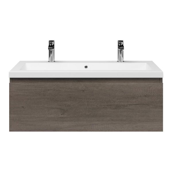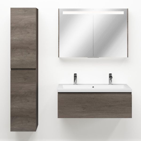 Greeploos badkamermeubel in de kleur olm donker grijs is 100 cm breed. De wastafel is vervaardig in quartz en heeft de kleur wit mat quartz. Dit badkamermeubel met deze wastafel is leverbaar tussen de 60 cm t/m 160 cm